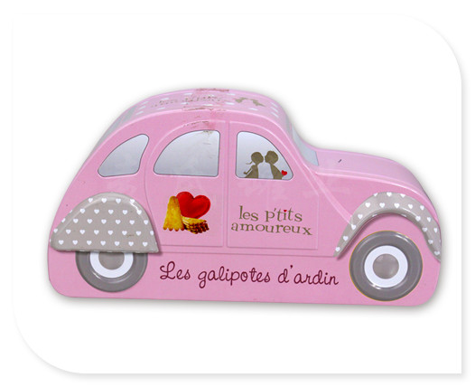 此款汽車形馬口鐵皮盒表面印刷為單面印刷,為CMYK四色+PSM專色處理,鐵盒外觀造型為小汽車形設(shè)計,版面整潔簡單,適合包裝各種精美禮品包裝,優(yōu)雅簡潔的設(shè)計風(fēng)格,能符合兒童年青時代包裝的需求。此款馬口鐵盒的版面設(shè)計稿可由客戶自行設(shè)計或我司設(shè)計。