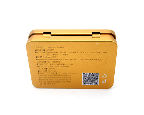 此款馬口鐵保健品鐵盒包裝為單面CMYK四色印刷處理,外過水性亮光油,內(nèi)涂金油,過油目的不僅能提高鐵盒整體效果,具有強烈的金屬質(zhì)感外,還對鐵盒印刷面形成一層致密的保護膜,對鐵罐刮花、防銹起到一定的防護作用。除了過光油、透明油外,客戶還可選擇過皺紋油、珠光油、爆炸油等。