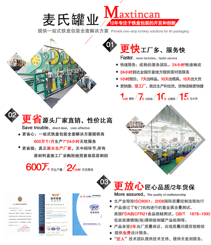 保健酒鐵盒加工廠——清遠市麥氏罐業(yè)多年來以的產(chǎn)品、誠信的服務深受廣大商家客戶的青睞。提供的產(chǎn)品質量上乘、價格合理,鐵盒產(chǎn)品多年通過ISO、SGS等機構測試,為您提供的鐵盒包裝產(chǎn)品。