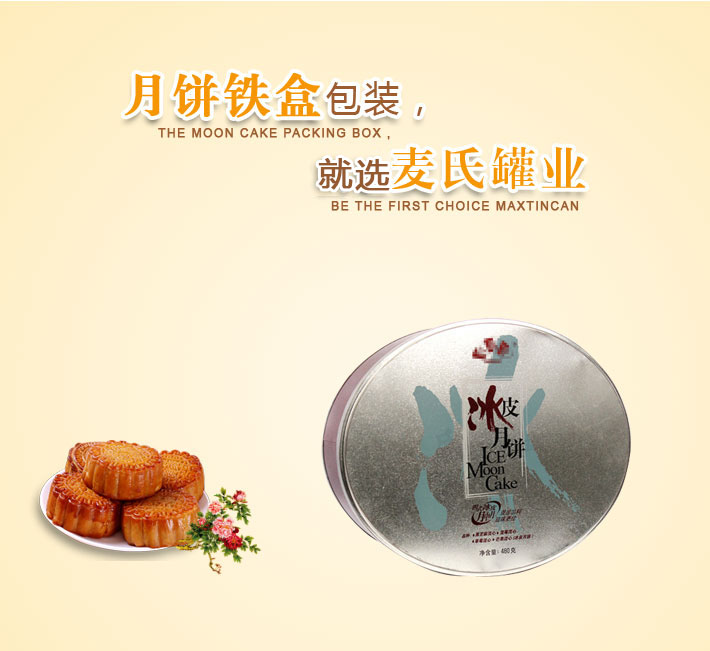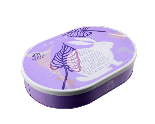 此款橢圓形中秋月餅鐵盒產(chǎn)品在印刷工藝方面,使用了四色與專色印刷工藝制作,內(nèi)外表面處理為過光油。鐵盒作有透鐵效果處理,使得鐵盒整體具有的金屬質(zhì)感。
