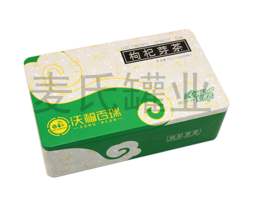 枸杞芽茶鐵盒,寧夏枸杞葉茶馬口鐵盒,采用單面1專色+四色印刷工藝制作,外過水性亮光油,內(nèi)過金油油,鐵盒整體為蓋、身、底印刷處理。此款鐵盒為200*90*83mm的規(guī)格尺寸,可包裝720g的枸杞芽茶,可選擇大容量的包裝需求。